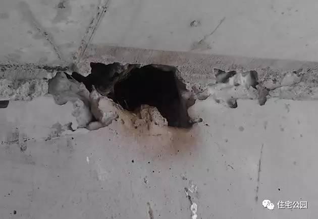 孔洞指商品混凝土结构内部有尺寸较大的空隙,局部没有商品混凝土或蜂窝特别大,钢筋局部或全部裸露。