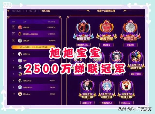 DNF神豪旭旭宝宝拿下斗鱼年度总冠军,再次给dnf涨排面,大家有何看法?