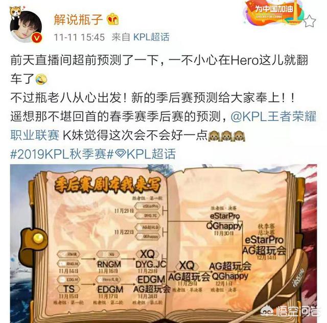 解说瓶子预测KPL季后赛走势,estar和AG会师总决赛,QG,XQ进四强,你认同吗?