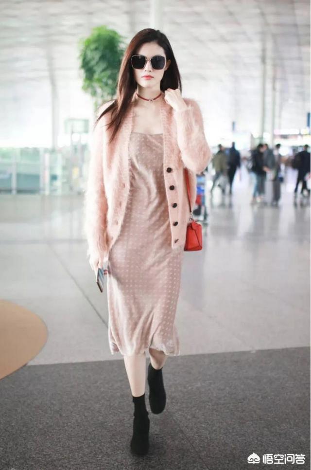 何仙姑身穿藕粉色波点连衣裙搭配同色系皮粉马海毛开衫,妥妥名媛风的即视感。