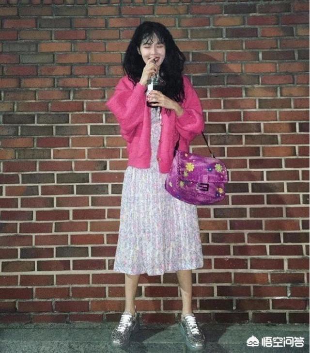针织开衫搭配裤子好看,搭配裙子也好看,搭配一条玫红色连衣裙,就是非常青春靓丽的。