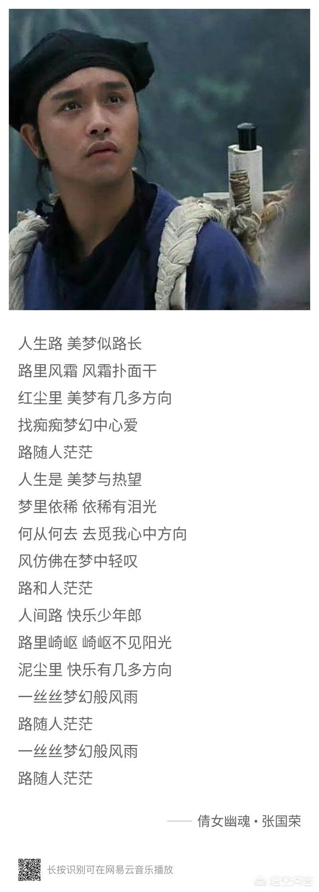 倩女幽魂:人生路,美梦似路长。梦里风霜,风霜扑面干。红尘里,美梦有几多方向。真是古风大气,一下子把我们带回了武侠世界,特别是哥哥的宁采臣,独一无二,魅力十足。