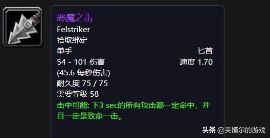 恶魔之击的特效:击中时可能下3秒攻击一定命中并且一定暴击。一定命中的实惠程度对于众多缺乏命中的职业那是真香,再加上暴击,是双香,而且,属于单手武器,不限定主手,这简直就是十三香。目前盗贼毁灭+狗牙,或者提布什么的站街可能大家也就是看看,但如果双持恶魔的话,相信一定许多人问你:你是魔鬼吗?毕竟许多战士抢起这个来人家也是理直气壮,如果再碰到几个纯白色小德或者发誓要一生存走到底的猎人给roll了,估计被刷到地老天荒也不一定。