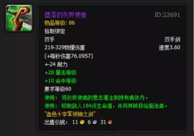 可能许多玩家都没见过也没听说过这把武器,这把武器也曾一度绝版,而传言在美服的8.0版本中这把武器高达1000万金币。也正因为这把武器,什么兄弟反目成仇啊,工会解散的戏码不断上演。作为 一把绿色武器,属性是在是太烂了。但是这把武器是整个魔兽世界最稀有的幻化之一,而其华丽的外观和自带的FM特效,让你站在街上就可以吸引一大帮人围观。不过在这把武器刚出之时的爆率便一度低的可怕,而在之后又数次绝版。