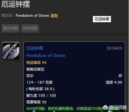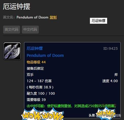 厄运钟摆,奥达曼小怪掉落的蓝色装绑双手斧,4.0的极限慢速使这把武器的伤害高的吓人,而且这把武器的等级还是39,简直就是40以下战场的专属秒人神器!实用和收藏极品!