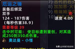 厄运之锤,原名厄运钟摆,同样是奥达曼小怪掉落的蓝色装绑双手斧,和暗炉火枪道理相同,4.0的极限慢速使这把武器的伤害高的吓人,而且这把武器的等级还是39,简直就是40以下战场的专属秒人神器!等到战场一开,拍卖行3000g价格都有人秒!