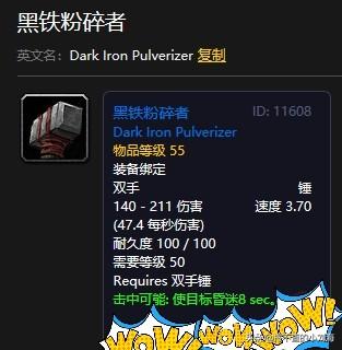 黑铁粉碎者,这把蓝色锤子想必很多人都是知道的,当年的PVP神器之一,仔细看效果不难看出来他的过人之处,没错,堪称逆天的8s眩晕想必不用我多做赘述大家也能知道这把双手锤在PVP中的价值。