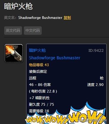 暗炉火枪,奥达曼小怪出品的蓝色装绑火枪,如果你有幸打出来这把枪,千万不要丢给商人,因为这是一把价值千金的PVP极品武器!大家都知道在wow里有一条规律就是速度快的武器伤害低,相反就是攻速越慢的武器伤害就越高!