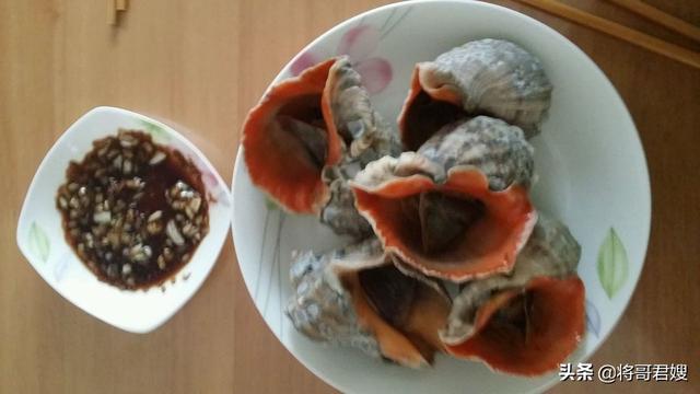 3.海螺 海螺有大有小,我们去渔民手里买的时候不可能把他大小分开(除非商家自己已经分出来了)烧海螺无非就是蒸或水煮,以为大海螺的壳太大红烧的话里面一下子烧不熟,所以水煮很清蒸就快很多了。锅里烧水,倒入料酒、姜片、葱白段、一点盐和海螺一起下锅煮,水开后在在煮十几分钟,捞出装盘。旁边放个蘸料碗(蘸料里有生抽、蒸鱼豉油、一点白醋和芥末或是生抽、辣椒末、一点白醋组成),一个大的海螺肉一口吃下去比一口吃一块肉要有嚼劲,还会产生一股满满的满足的感(吃海螺的时候要先把苦胆和腮去掉,吃多了会头晕)。