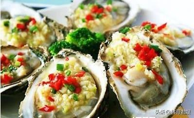 1.生蚝 我们经常去外面吃烧烤的时候,烧烤摊上的蒜蓉烤生蚝是必点的美食之一了。现在我们不烤,把生蚝拿来蒸。生蚝用刷子把外面的壳刷干净,用开生蚝的刀从两块蚝壳中间翘开割断中间的上下连接的蚝精。在把深一点的蚝壳留下来用于放肉用,放蚝肉的壳和肉都要在洗一遍(蚝壳里面有些像虫一样的异物要给它搞破在冲洗干净,如果是烧烤的话那东西是会爆炸的)。把洗好的生蚝码好上蒸锅上蒸个十分钟左右开锅加上自己做好的蒜泥盖锅盖在蒸个五六分钟就可以出锅,撒上一点葱花。外观漂亮有鲜香嫩滑,味道不输烤出来的生蚝差。