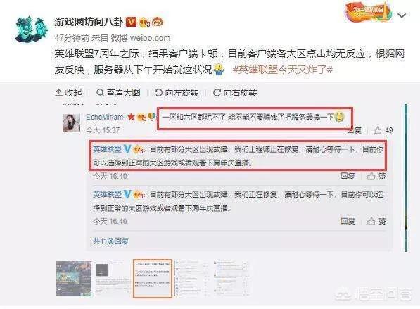 就在昨天,一个微博大V在发出通知,英雄联盟7周年之际,结果客户端卡顿,目前英雄联盟各大区点击均无反应,根据网友反应,服务器从下午开始就这个状况了!随后英雄联盟官方回应此事,表示目前部分大区出现这种情况,我们的工程师正在紧急的修复,请耐心的等待一下,目前可以选择正常的大区游戏或者观看一下周年庆直播!