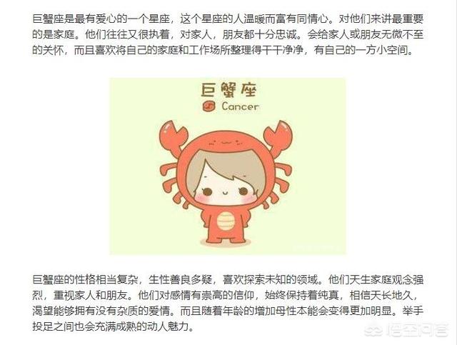 比如题主提到的巨蟹座,主要特点是:表面坚强内心柔软、内向、消极、情绪化、缺安全感、家庭观念很强。
