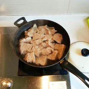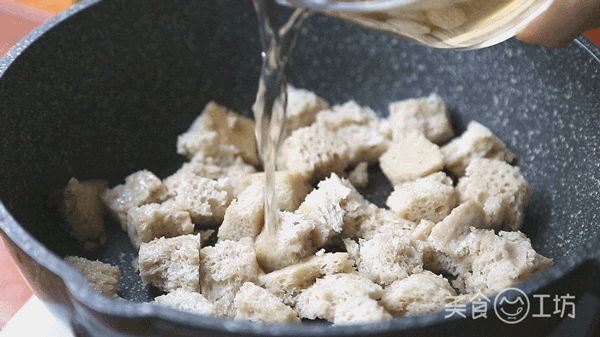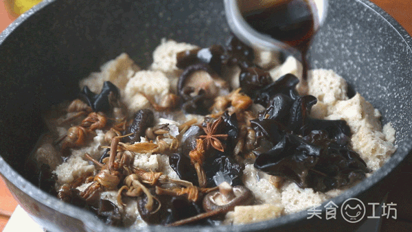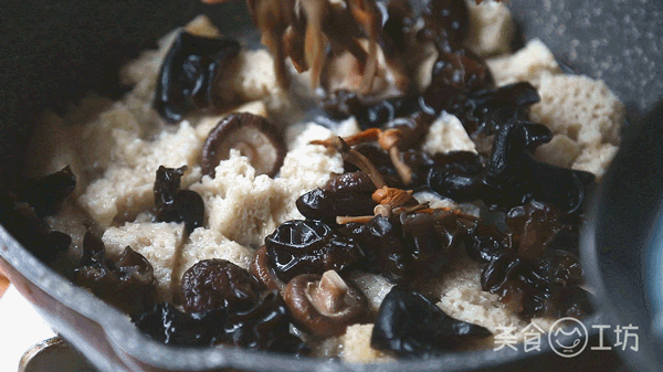 4、锅内放入馨油爆香香菇及笋块,再放入炸好的烤麸,日式香菇露、素蚝油、味淋、盐、水1000CC,小火煮至汤汁微干即可。