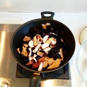 2热油锅,倒入烤麸,煎至两面金黄,倒入香菇,木耳,加入生抽,老抽,冰糖,加适量热水