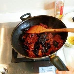 5、锅留底油,加入酱油、绍酒、白糖,水,放入烤麸及配料,大火烧开,改小火焖烧至30分钟以上至卤浓。