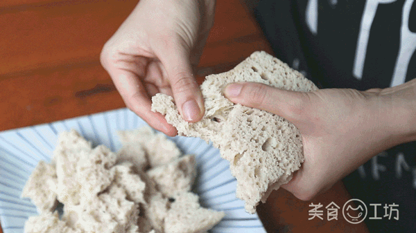 2.如果是干烤麸也需要用清水泡开,将烤麸撕成一块块,然后在水龙头下冲洗干净挤干备用。