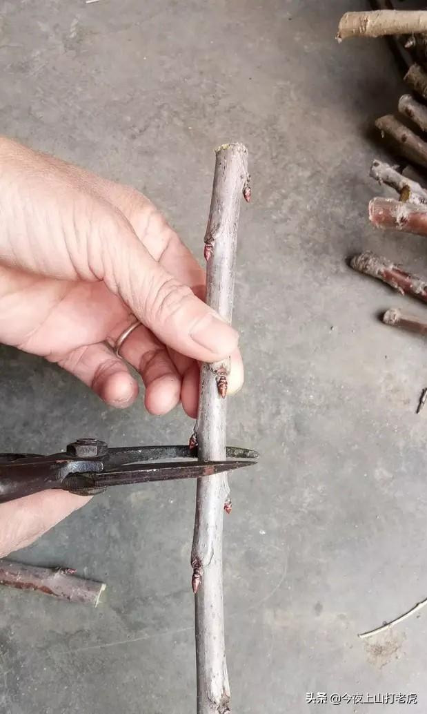 注意,枝条要修剪成有四个芽孢为一小段就好,这样在用劈接嫁接的时候,两个芽孢被削,插入占木。两个芽孢才是正常发芽的保留。