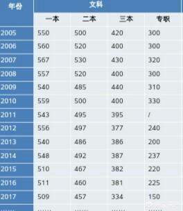 先看一下西安历年的文科分数线,从中可以发现近3年一本的分数线在510分左右,二本的分数线在460分左右,三本低于400分。