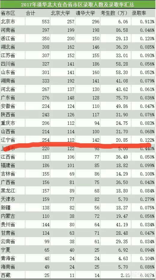 看上图,2017年辽宁省北大录取人数为112人,清华录取人数为142人。人数非常之少,可以说是万里挑一啊!