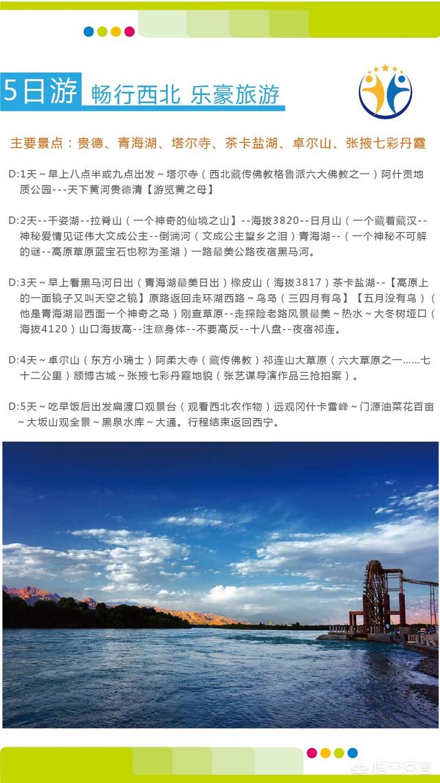 第四天早上出发去青海湖,环湖一般情况下过日月山倒淌河,然后到二郎剑风景区,这里是青海湖最美的地方,也是中国第一个导弹基地。在二郎剑风景区游玩以及吃饭,然后再向前出发,直到黑马河住宿休息。这一路上都在湖边走,所以可以随时停下到边里游玩,不过湖边需要花钱的,一定要给藏民钱,以后再进去,省得引起不必要的误会。第五天早上出发去茶卡盐湖,茶卡盐湖,据说是王母娘娘掉下的镜子,是天空之镜,查卡盐湖大约呆两小时左右再回到青海湖边,继续向北走过鸟岛,然后去往祁连县,在祁连县住宿。第六天在祁连县看牛心山和卓尔山,牛心生,山顶常年积雪,山下麦浪滚滚,可以体验一山看四季,祁连山下好牧场说的就是牛心山坡上。卓尔山,牛心山隔河相望,他俩还有一段爱情传说,这里有小瑞士之称,尤卓尔山大概两三个小时。然后出发向西宁往回走,路上随走随停参观游览,到门源时可以参观门源的百亩油菜花海,七月中下旬是门源油菜花开的正旺盛的时候,过了门源以后就可以直接回到西宁市住宿,到西宁时估计已经,晚上八九点钟了。在宾馆住宿一晚后,第二天不用早起,起床后去到西宁市内墨家街买一些旅游纪念品,然后去市内的大清真寺参观大清真寺,在礼拜日的时候,四周都要封路来进行信徒礼拜活动,到时路上会跪满人群。离大清真寺不远的马步芳公馆,不知道今年会不会开放,那里是西北军阀马步芳的旧居,里面有他的地道,可以参观一下,还有他警卫营的宿舍,也可以参观一下。然后就是,有南禅寺和北禅寺,可以去参观一下,南禅寺是最早的关公庙逐渐发展出来的有关公庙,佛教庙以及道观几种形式的建筑在这里边。在西宁住最后一晚上后,就可以准备回北京了。