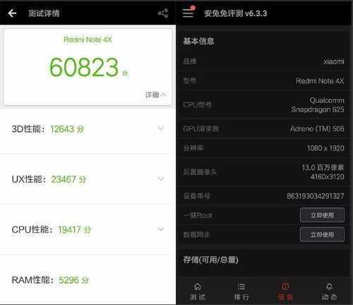 再来看看红米note4x,其采用了骁龙625处理器,使用了3G运存。其安兔兔跑分情况为3D性能得分为12643分,UX性能为23467分,CPU性能为19417分,RAM性能分为5296分,综合跑分为60823分。