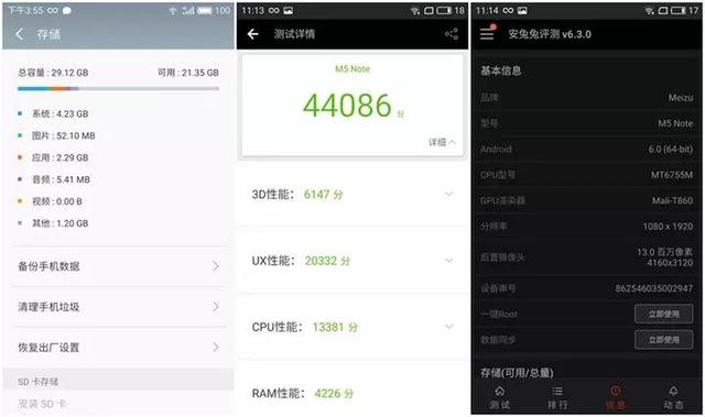 魅蓝note5采用了联发科P10加上3G内存配置,3D、UX、CPU、RAM各项评分分别为6147分、20332人、13381分和4226分,安兔兔跑分这44086分。