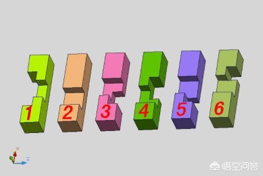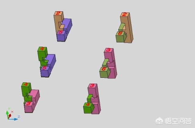 这是一个在用《鲁班锁(孔明锁)的结构分析法》计算25个可锯块可拼合多少个锁的计算中发现的6柱组,它可以有8种不同的拼合方法。现在将它作为《鲁班锁(孔明锁)的结构分析法》使用实例来分析,以补《鲁班锁(孔明锁)的结构分析法》之九被判“私有”,不可公开的缺憾。 这是这个6柱组:
