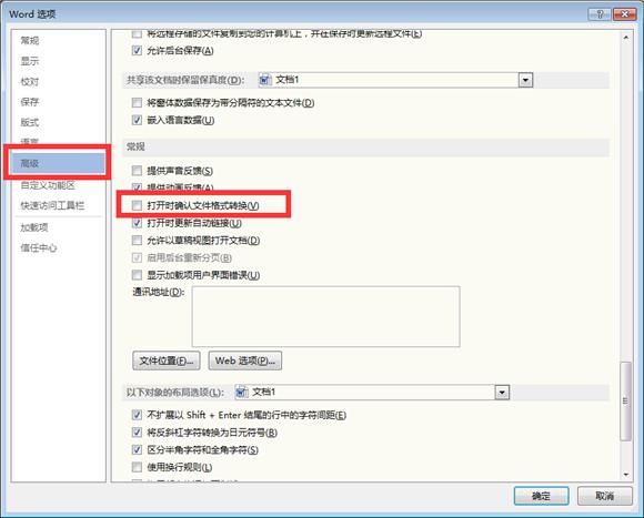 进入到“高级”选项卡,然后在右侧找到“打开时确认文件格式转换”,勾选它,再确定就行了。