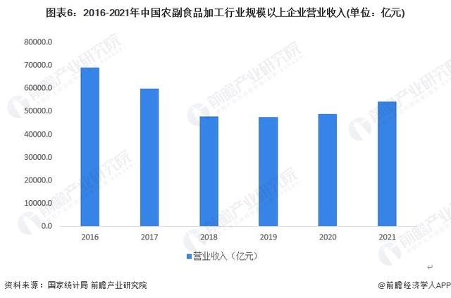 根据国家统计局数据,2018年以来,我国农副食品加工业市场规模整体呈增长趋势,2021年规模以上企业营业收入达54107.6亿元,同比增长10.9%。