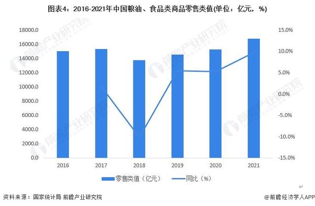 根据国家统计局数据,2016-2021年,我国粮油、食品类商品零售类值整体呈增长趋势,2021年达到16759.1亿元,同比增长9.7%。