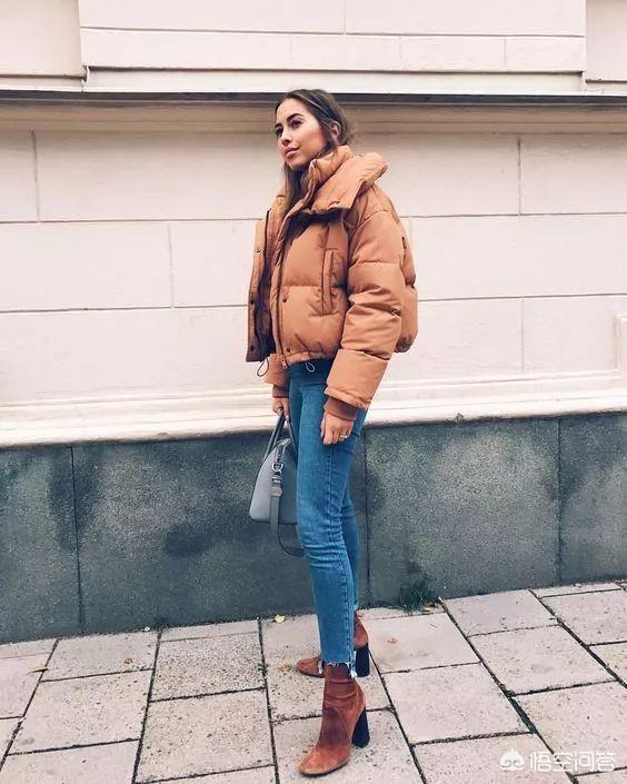 短版羽绒外套简单搭配一件修身裤,营造出上宽下窄的视觉效果,还可以提高腰线,显得让你更显腿长。