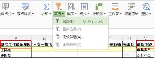 使用表格处理工具中“筛选功能”,一般用“自动筛选”或“全部筛选”就可以实现。筛选功能开启后,会在每个项目中出现一个下拉菜单,需要在菜单中选择适合自己的内容。选择的顺序是:专业、学历、政治面貌、备注、特殊要求等。对于通过并且服务期满的“四计划”、“村官”、“选调生”等岗位的考生,则建议最好选择与自己条件相对应的岗位,降低报考压力。需要注意的是,表头需要调整成为以“序号”、“招考单位”、“职位名称”、“招考人数”等内容的那一行。如果这一行的上面有其他表头,则必须删除掉。