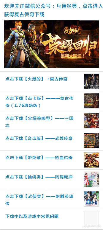 推荐一个不错的公众号:互通经典,游戏多多,经典耐玩,各种版本的传奇都有,电脑手机(安卓苹果 IOS)都可以玩,三端互通,如图