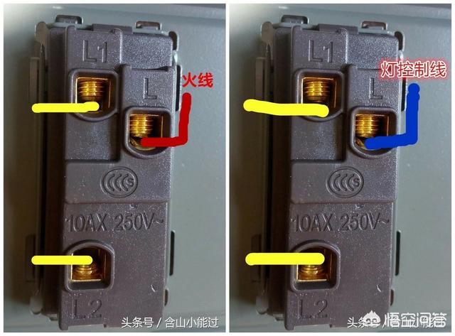 单控开关每组二个接线孔L接火线L1接灯控制线。双控开关每组三个接线孔L接火线或灯控制线,L1丶L2接二根双控回路线。