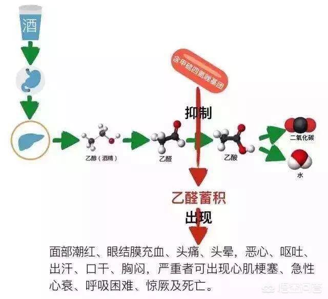 众所周知,酒的主要成分是乙醇,正常情况下,乙醇进入人体后被转化为乙醛,乙醛再经乙醛脱氢酶转化为乙酸,代谢为无毒的产物。但如果使用了头孢,头孢就会抑制乙醛脱氢酶的活性,使乙醛无法被转化,导致乙醛在体内蓄积。由于乙醛具有心脏毒性,故会引起一系列心血管反应、中毒反应,如头痛、头晕、口唇发绀、呼吸困难、心悸、胸闷、胸痛,甚至会引起严重低血压、过敏性休克、急性心衰、恶性心律失常,心肌梗死等。由于头孢在此反应中,产生了类似双硫仑的作用(双硫仑为一种解酒药),故我们称上述一系列反应为双硫仑样反应。