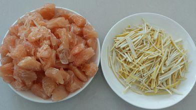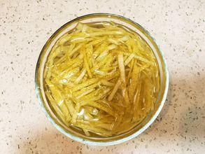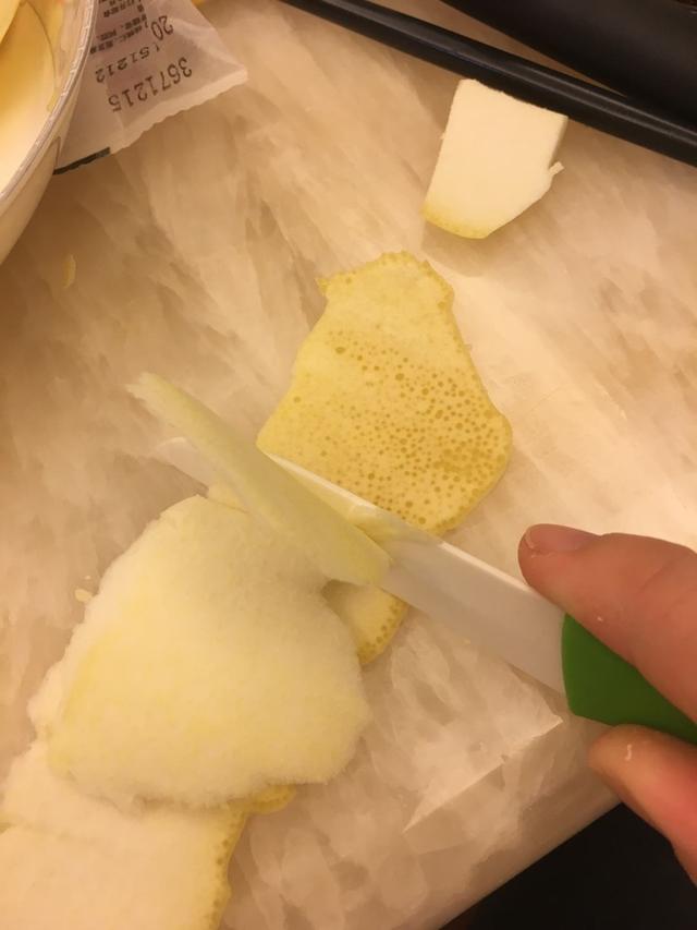 3、用食盐用力揉搓柚子皮,使柚子皮中的苦味析出,再用清水漂净,这个步骤可重复两到三次。柚子皮改刀切成细丝,越细越好,放入淡盐水中浸泡15分钟。