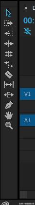 第一个箭头是选择工具,第二个是向前选择轨道工具,单击后就会选中所有轨道中右侧的所有剪辑,第三个是向后选择轨道工具,第四个是波纹编辑工具,第五个是滚动编辑工具,第六个是比率拉伸工具,第七个是剃刀,应该是我们会经常用到的工具,可以裁剪视频,第8个是外滑工具,第9个是內滑工具,下面依次是钢笔工具、手形工具、缩放工具。