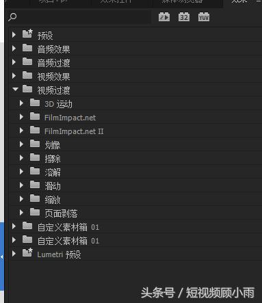 接下来讲的就是视频效果设置,打开效果后,里面有一列,打开后里面还有很多东西的,预设里我们常用的有马赛克、画中画接下来就是音频效果和音频过度,可以用来处理一些音频,下面的视频效果我们也会用到,里面有镜像啊、位移啊,不过要想用好还是要下功夫,一些比较简单的短视频应该用不到,下面的视频过度我们会经常用到,可以在换场景时没有那么生硬。有擦除、溶解、滑动等等,可以根据你的需要进行选择。