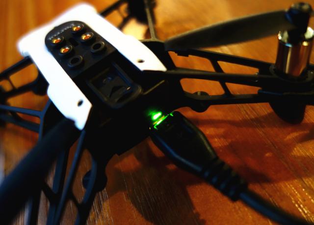 正面的两颗LED灯是Parrot Mambo的灵魂所在,飞行期间会常亮,日间觉得没什么,在漆黑的夜晚是你唯一辨别Parrot Mambo方向和调整位置的地方。满电状态为绿色灯光,电量较少式为红色,刚开机时为橙色,每次都感觉在传递一个信号:报告,已经做好起飞准备。