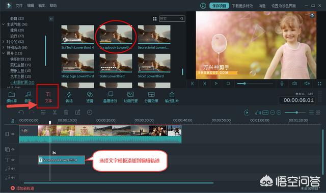选择“文字”功能里的一个字幕模板,双击添加到视频,调整位置和文字内容。