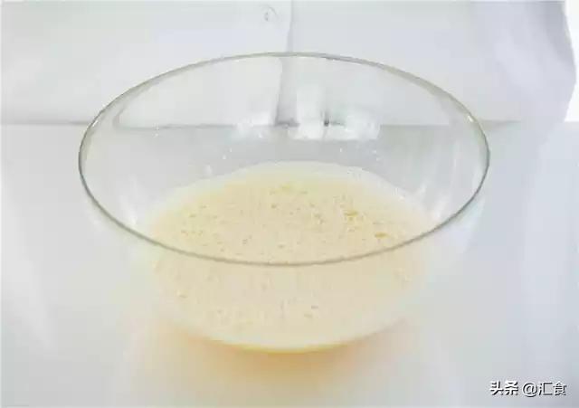 此时蛋液气泡很大,颜色稍微变浅,蛋液体积稍有变大。