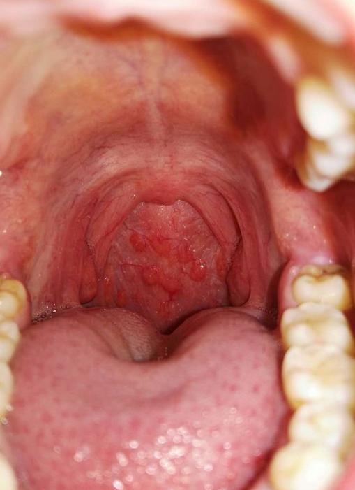 ⑤ 喉咙舌根底部、舌头顶部有小泡泡,小疙瘩情况,尤其有烟酒习惯男士,爱辛辣刺激食物,长期过渡用嗓人群等,出现这种症状是淋巴滤泡性咽炎。