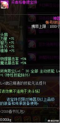 论提升建议选择头肩技能宝珠,头肩宝珠这几年一直都没什么变化,属性一直都是+75四维,5%的物魔暴击,1~30主动技能+1,而今年的技能增加属性则更改为1~50主动技能+1,增加了35,40,45,50四个技能提升可有说非常大,特别适合一觉打爆发的职业,比如奶爸奶妈,剑豪,剑魂等。