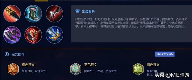 我个人建议是百穿搭肉打野刀攻速鞋的出装,这套是比较常规的,适合新手,如果你对自己操作比较自信,可以选择攻速打野刀,其他如下图。