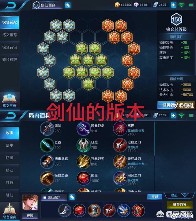 一技能没改版之前,建议带26攻速,也就是狩猎 鹰眼 红月 现在改版之后,建议带百穿,也就是异变 隐匿 鹰眼。不依赖攻速,因为一技能刺过去能积累剑气,更快打出被动,解锁大招。出装 红色打野刀 抵抗之靴 吸血刀 暗影战斧 破军 破甲弓 后期可以把红色打野刀换成名刀或复活甲。