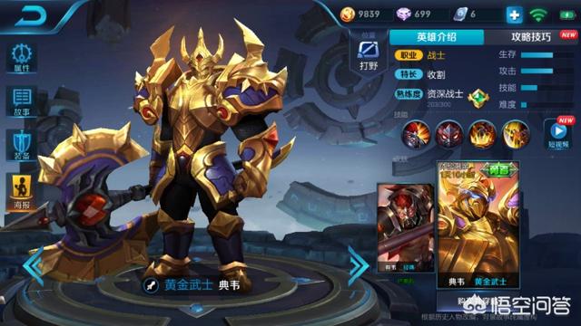 如果说武士的铠甲这么粗制滥造,那么生产铠甲的伙计们八成是要被砍头了。黄金武士给我的感觉一直是头重脚轻的样子,而且腿还有点短,颇有点小鲁班的风采,反正怎么看怎么变扭。作为元老级英雄,典韦同样只有一款888勇者皮肤。