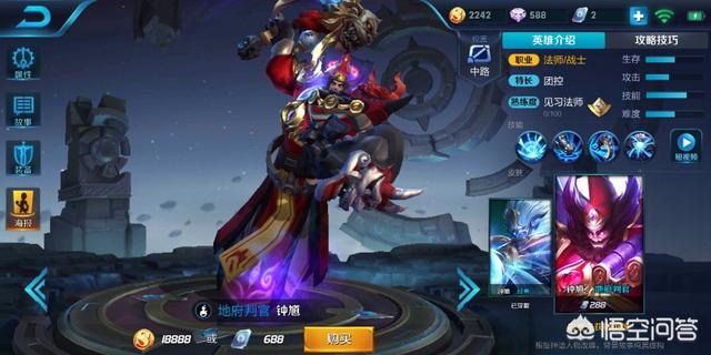 钟馗这个英雄就跟英雄联盟上的锤石差不多,也不完全算冷门,但是上场的频率也是够低的。皮肤就一个地狱判官,而且还是最低配288点券的,心酸。钟馗:老子一天勾那么多人,没有功劳也有苦劳啊。