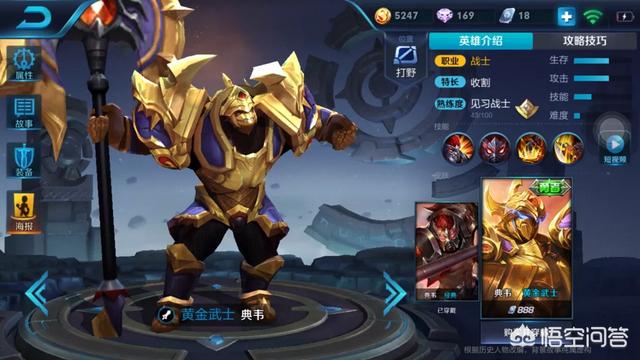 而典韦的这款皮肤叫黄金武士,嗯!确实是黄金的颜色,但是总有种怪怪的感觉,萌萌的有木有,一点都不威猛。相对于钟馗来说配置要高一点,888点券,不过也是一个。典韦:老子一天要斩多少个人头,老妈你直接告诉我具体我要斩多少人头才给我做皮肤?