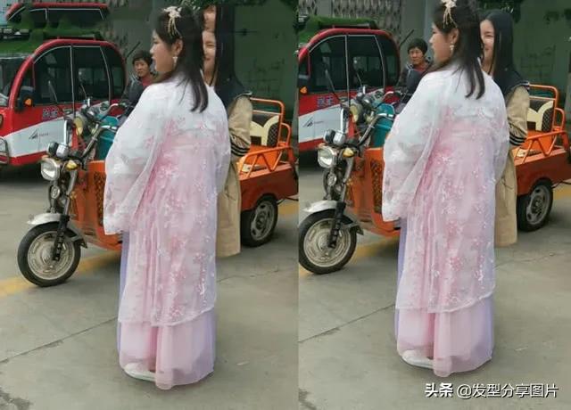 让我们来看一下这个女生吧,看样子也是挺沉的吧,不过穿上这个汉服之后显的侧脸是比较消瘦的,肉肉的小脸也是挺可爱的,这梳着精致的发髻,这个粉色的汉服也是挺有少女心的吧,感觉旁边那个女生也是差不多吨位的吧,但其实就汉服是更胜一筹的,看着就淑女文静了不少吧,别有一番美感,随意搭配小白也是潮到爆!