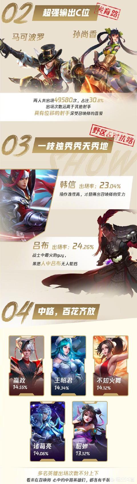 抗压路:吕布作为抗压路的扛把子,出场率超过了24%,赛场上的吕布比排位中的吕布风评差异太严重,主要是打法的问题,赛场上的吕布可以用大招来开团,因为队友会跟,可以上高地封走位,因为队友在身后,而排位就很一言难尽了。